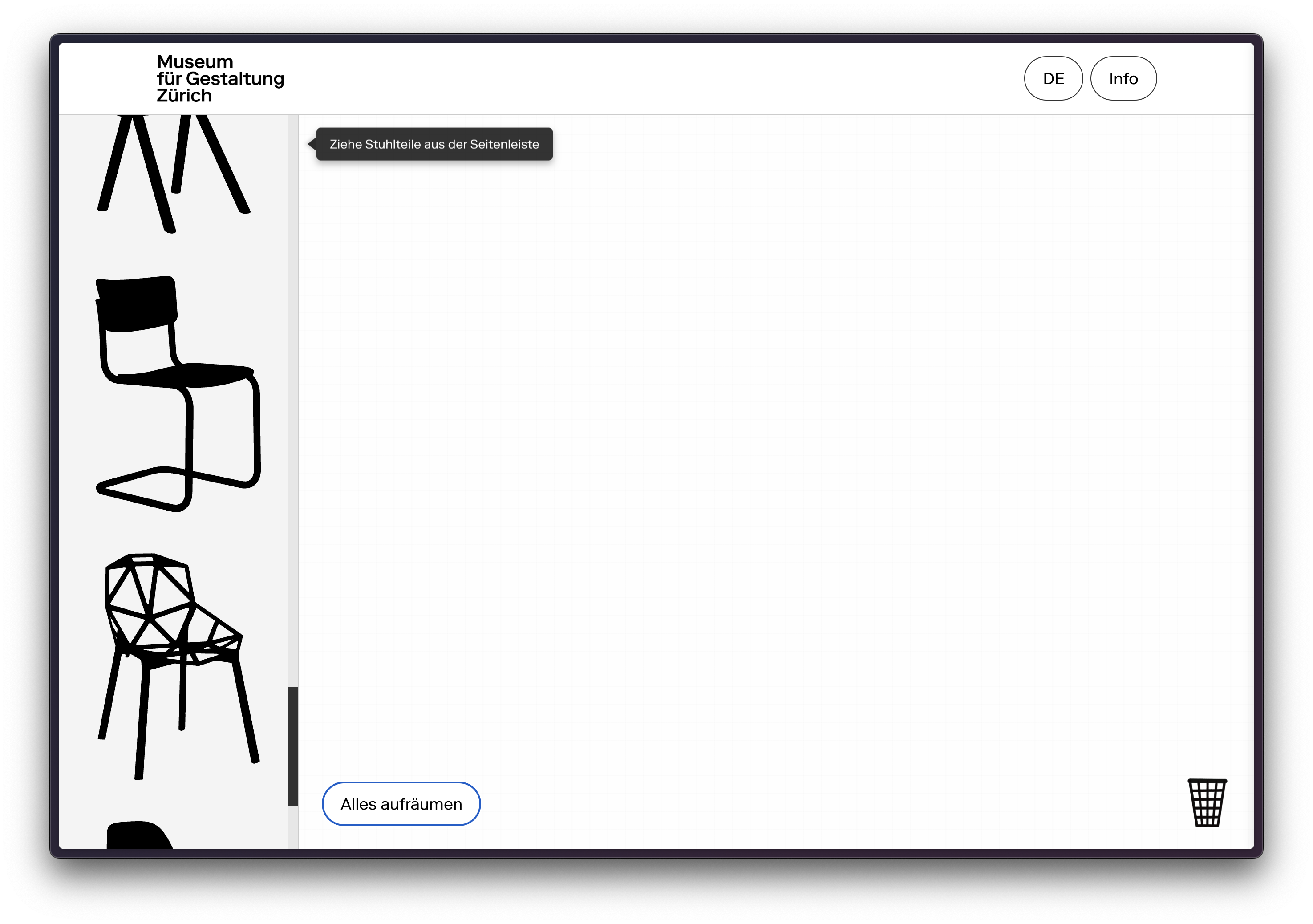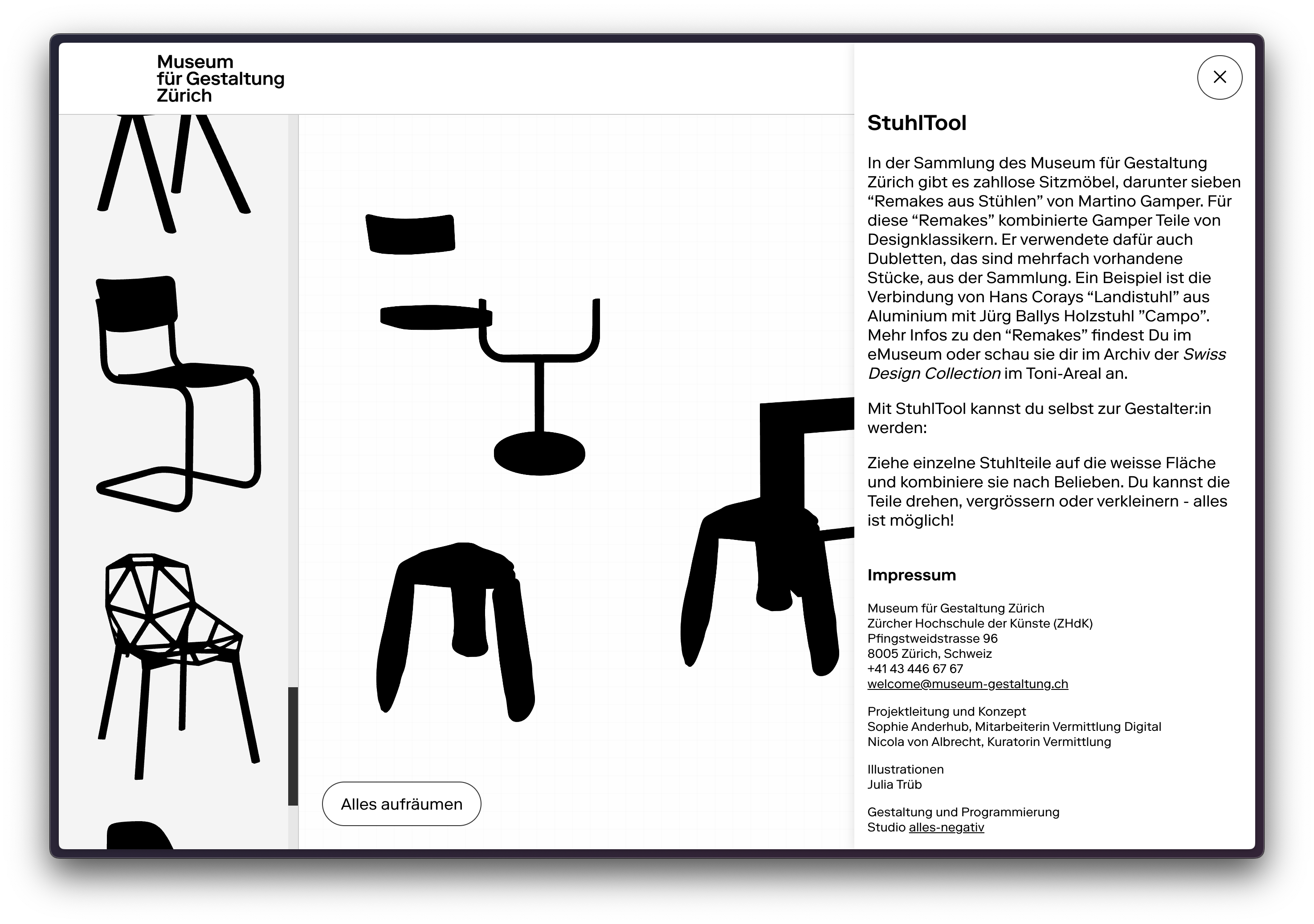 Sophie approached us with the idea of an interactive extension of Martino Gamper’s “Remakes aus Stühlen” in the collection of the Museum für Gestaltung Zürich. Sophie was fascinated by the way Gamper combines elements of classic chairs into new, surprising forms — playful yet thoughtful experiments in design and authorship. With StuhlTool, we aimed to translate this idea into a digital space, enabling visitors to experience this creative process firsthand. The tool lets users drag and drop chair parts onto a blank surface, rotate and resize them, and create their own “remakes.” It’s both a game and a reflection on how design evolves through combination, reinterpretation, and chance. The tool is currently exhibited at the Museum für Gestaltung in Zurich.